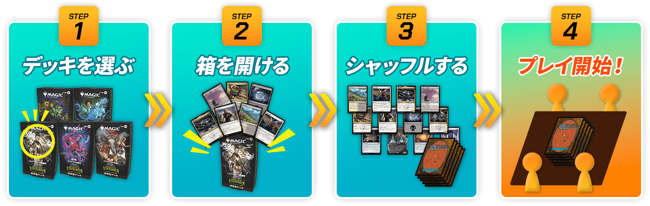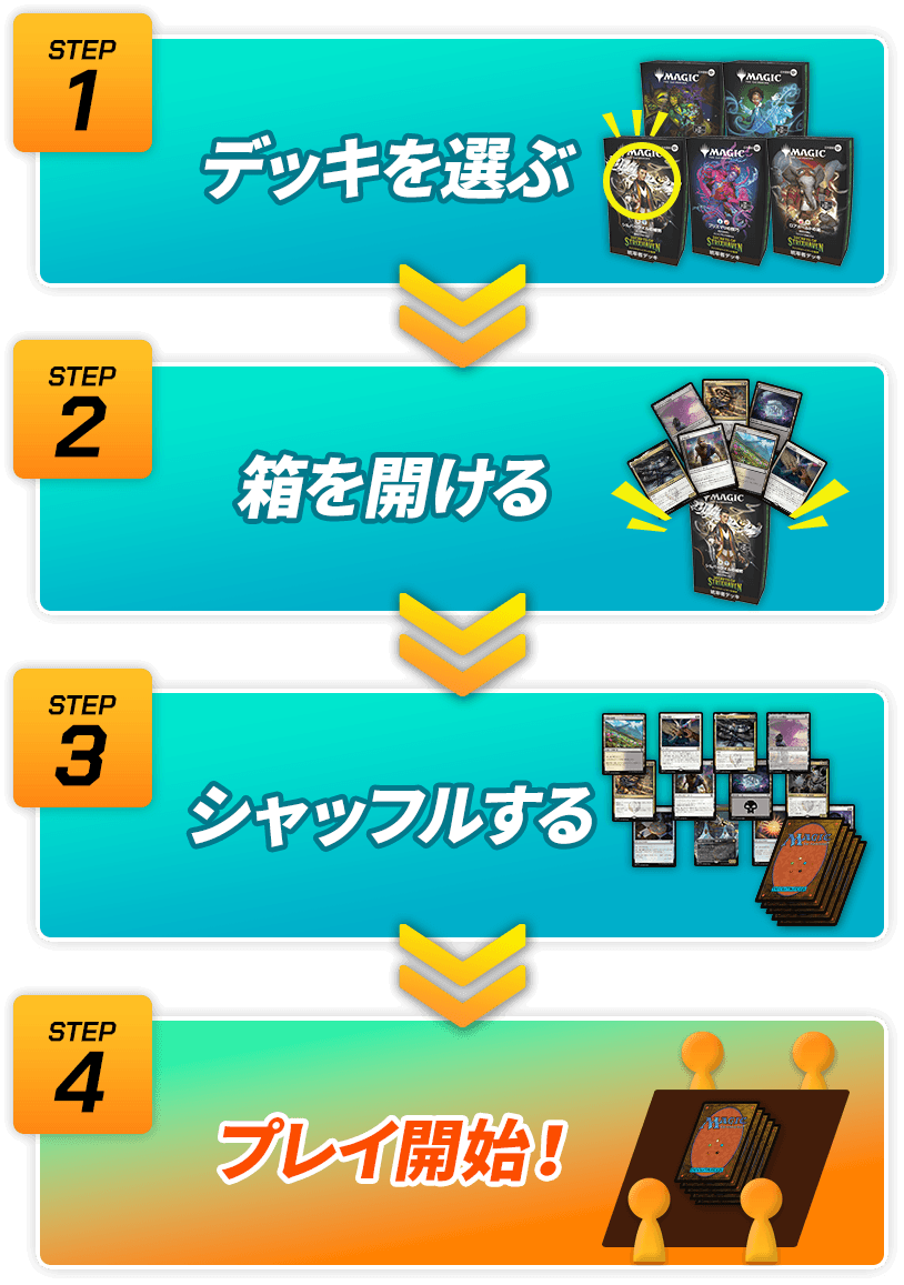 とはいえ、いきなり100枚のデッキを組むのは大変かも?と思った方もいると思います。安心してください、そんな方にオススメな、いちばん手軽な始め方が、コマンダー用の構築済みデッキ(統率者デッキ)をひとつ選ぶことです!