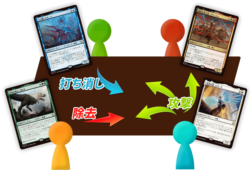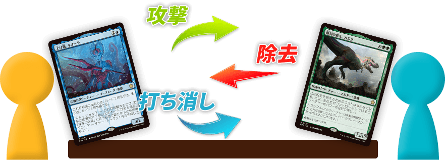 1対1の対戦では、相手のクリーチャーはすべてこちらを攻撃してきますし、除去や打ち消しといった妨害カードはすべてこちらに向かって撃たれます。