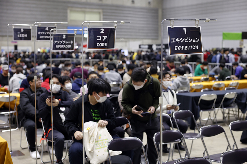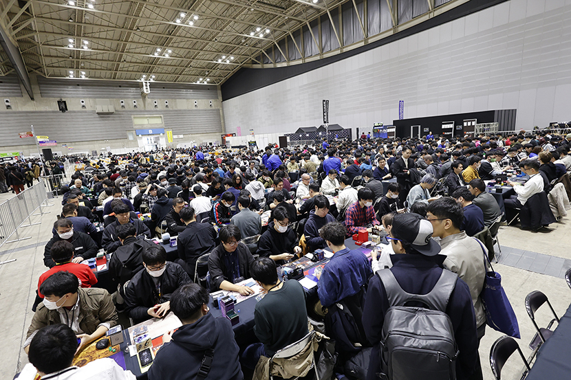 会場全体を見下ろすとこんな感じです。チャンピオンズカップファイナルが左奥、右奥でレガシー選手権、右中央でリミテッドオープンが開催中。左手前の黄色いテーブルがコマンドゾーンで、縦中央にショップエリアがあります。