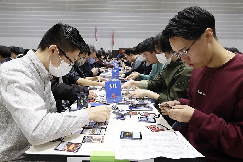 誰でも参加できるオープントーナメントで、約330人のプレイヤーが集まり、現在デッキ構築中です。