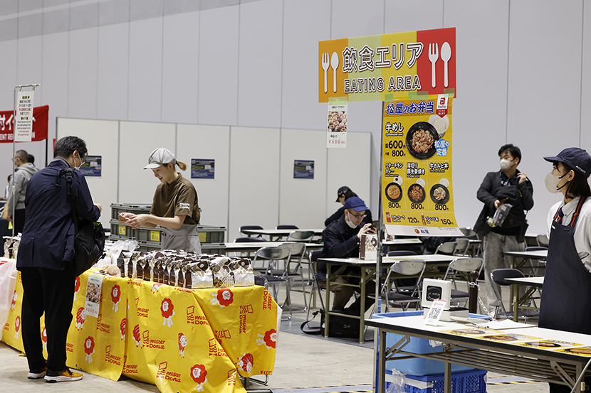 おなかがすいたら飲食エリアへ。牛めしなどを販売しています。期間限定の栗のドーナツもあるとか。