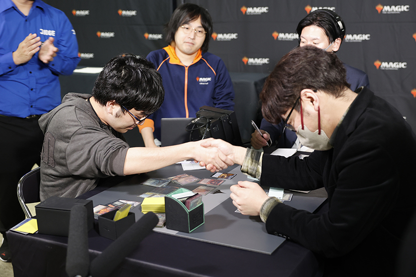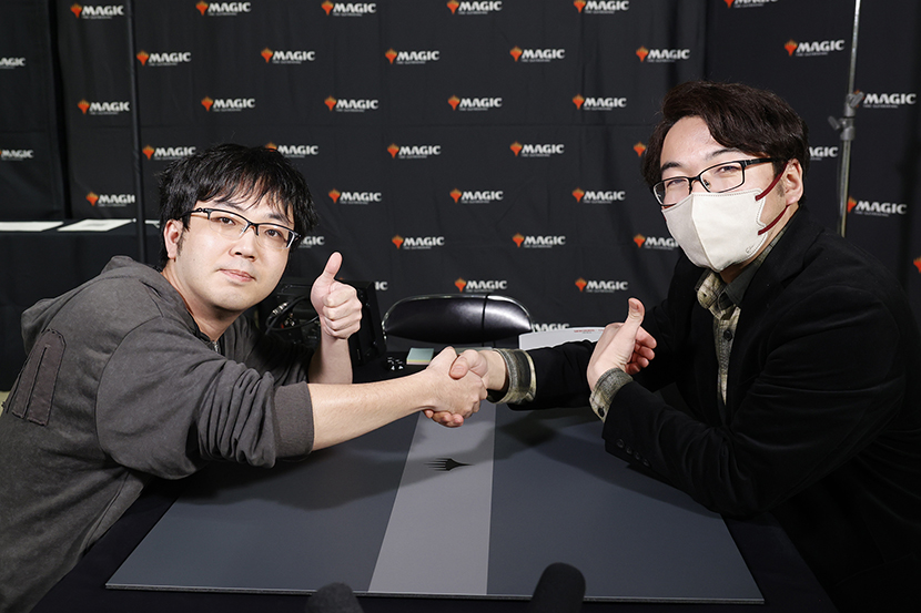 数ターン経ち、ついに《鏡割りの寓話》も変身。盤石な体勢を整えていた堀に対する解答を引き込めなかった奥野は、この日ともに決勝の舞台を戦ったライバルへと右手を差し伸ばした。