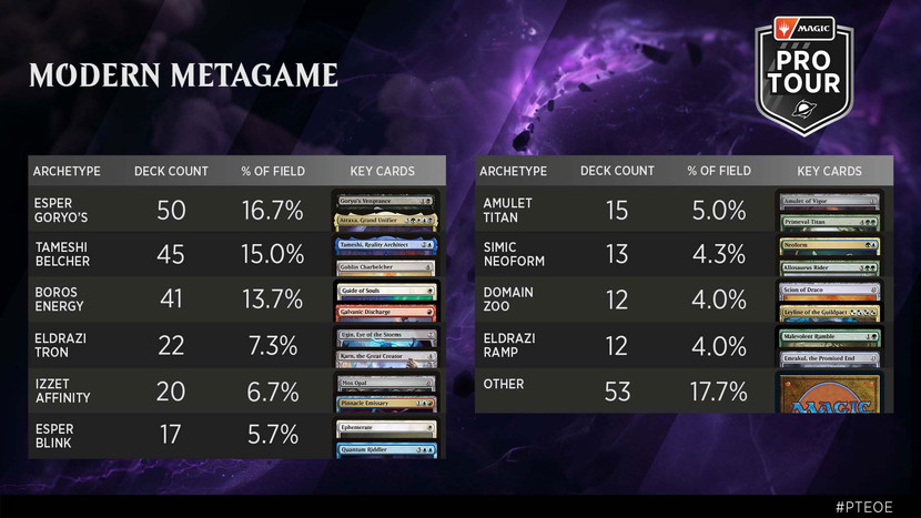 このプロツアーでは、アグロ、ミッドレンジ、コントロール、コンボ、ランプといった多様なアーキタイプが存在感を示している。エスパー御霊、タメシ・ベルチャー、ボロス・エネルギーといったデッキが上位のシェアを握っている一方で、全体としてメタゲームの多様性は維持されている。平均すると、同系対決は10.9卓に1度しか発生しない計算となっており、これは過去10回のモダンプロツアーのうち半数以上よりも高いメタの多様性を示している。