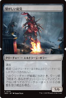 このクリーチャーが戦場に出たとき、ターン終了時まで、あなたがコントロールしていてこれでないすべてのクリーチャーは+1/+0の修整を受け威迫を得る。