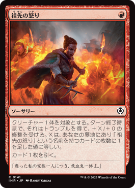 クリーチャー1体を対象とする。ターン終了時まで、それはトランプルを得て、+X/+0の修整を受ける。Xは、あなたの墓地にあり「祖先の怒り」という名前を持つカードの枚数に1を足した値に等しい。