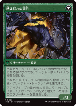 あなたがコントロールしていて狼男や狼でありこれでないすべてのクリーチャーは+1/+1の修整を受ける。