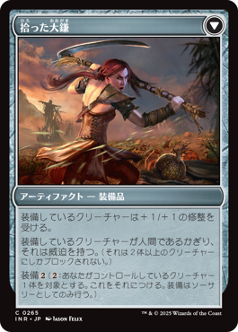 装備しているクリーチャーが人間であるかぎり、それは威迫を持つ。(それは2体以上のクリーチャーにしかブロックされない。)