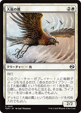 このクリーチャーがプレイヤー1人に戦闘ダメージを与えるたび、「あなたのライブラリーから『大嵐の鷹』という名前のカード1枚を探し、公開し、あなたの手札に加える。その後、ライブラリーを切り直す。」を選んでもよい。