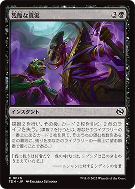 諜報2を行い、その後、カード2枚を引く。2点のライフを失う。(諜報2を行うとは、あなたのライブラリーの一番上にあるカード2枚を見て、そのうちの望む枚数をあなたの墓地に、残りをあなたのライブラリーの一番上に望む順番で置くことである。)