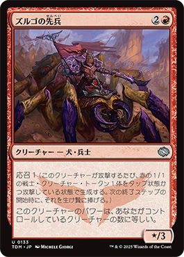 応召1(このクリーチャーが攻撃するたび、赤の1/1の戦士・クリーチャー・トークン1体をタップ状態かつ攻撃している状態で生成する。次の終了ステップの開始時に、それを生け贄に捧げる。)