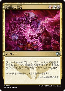 クリーチャーやプレインズウォーカーである1体を対象とする。除細動の電流はそれに4点のダメージを与え、あなたは2点のライフを得る。