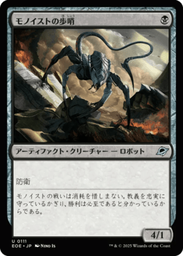 HOME > PRODUCTS > カードギャラリー > 久遠の終端 CARD GALLERY 『久遠の終端』のカード 《モノイストの歩哨》 Artifact Creature - Robot 4 / 1 Defender Monoists fight a war of attrition, knowing their victory is inevitable so long as they stay true to their faith. Defender カードテキストは印刷カードのテキストをもとにしています。 『久遠の終端』のカード一覧