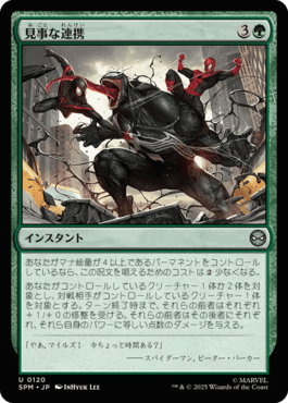 あなたがコントロールしているクリーチャー1体か2体を対象とし、対戦相手がコントロールしているクリーチャー1体を対象とする。ターン終了時まで、それらの前者はそれぞれ+1/+0の修整を受ける。それらの前者はその後者にそれぞれ、それら自身のパワーに等しい点数のダメージを与える。
