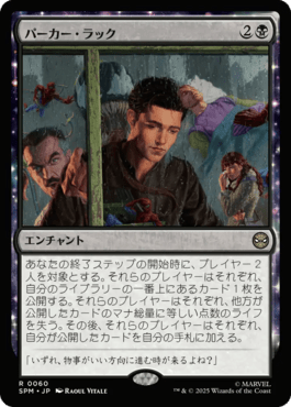 あなたの終了ステップの開始時に、プレイヤー2人を対象とする。それらのプレイヤーはそれぞれ、自分のライブラリーの一番上にあるカード1枚を公開する。それらのプレイヤーはそれぞれ、他方が公開したカードのマナ総量に等しい点数のライフを失う。その後、それらのプレイヤーはそれぞれ、自分が公開したカードを自分の手札に加える。