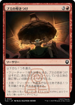 ・クリーチャー1体を対象とする。ブミの叩きつけはそれに、あなたがコントロールしている土地の数に等しい点数のダメージを与える。