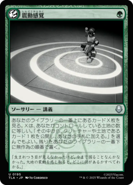 あなたのライブラリーの一番上にあるカードX枚を見る。Xは、あなたがコントロールしている土地の数に等しい。「その中から、クリーチャーや土地であるカード1枚を公開し、あなたの手札に加える。」を選んでもよい。残りをあなたのライブラリーの一番下に無作為の順番で置く。