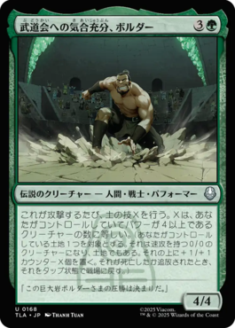 これが攻撃するたび、土の技Xを行う。Xは、あなたがコントロールしていてパワーが4以上であるクリーチャーの数に等しい。(あなたがコントロールしている土地1つを対象とする。それは速攻を持つ0/0のクリーチャーになり、土地でもある。それの上に+1/+1カウンターX個を置く。それが死亡したか追放されたとき、それをタップ状態で戦場に戻す。)