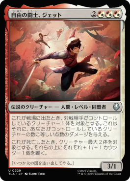 When Jet enters, he deals damage equal to the number of creatures you control to target creature an opponent controls.When Jet dies, put a +1/+1 counter on each of up to two target creatures.