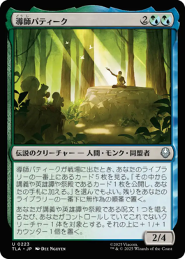 導師パティークが戦場に出たとき、あなたのライブラリーの一番上にあるカード5枚を見る。「その中から講義や英雄譚や祭殿であるカード1枚を公開し、あなたの手札に加える。」を選んでもよい。残りをあなたのライブラリーの一番下に無作為の順番で置く。