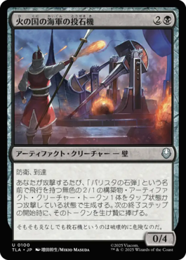 あなたが攻撃するたび、「バリスタの石弾」という名前で飛行を持つ無色の2/1の構築物・アーティファクト・クリーチャー・トークン1体をタップ状態かつ攻撃している状態で生成する。次の終了ステップの開始時に、そのトークンを生け贄に捧げる。