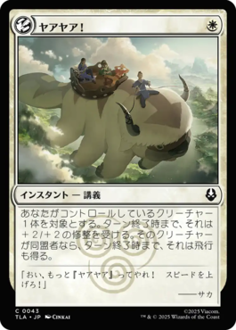 あなたがコントロールしているクリーチャー1体を対象とする。ターン終了時まで、それは+2/+2の修整を受ける。そのクリーチャーが同盟者なら、ターン終了時まで、それは飛行も得る。