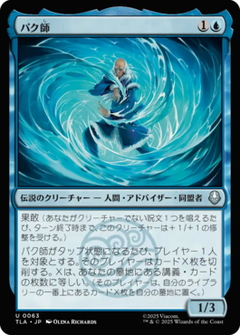 パク師がタップ状態になるたび、プレイヤー1人を対象とする。そのプレイヤーはカードX枚を切削する。Xは、あなたの墓地にある講義・カードの枚数に等しい。(そのプレイヤーは、自分のライブラリーの一番上にあるカードX枚を自分の墓地に置く。)