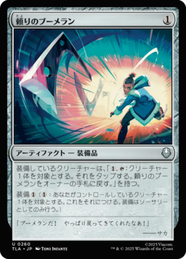 装備しているクリーチャーは、「{1}, {T}:クリーチャー1体を対象とする。それをタップする。頼りのブーメランをオーナーの手札に戻す。」を持つ。