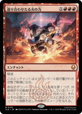 あなたがコントロールしている発生源1つが、対戦相手や対戦相手がコントロールしているパーマネントにダメージを与えるなら、代わりに、それはその点数にこのエンチャントの上にある火カウンターの個数を足した点数のダメージを与える。