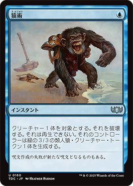 クリーチャー1体を対象とする。それを破壊する。それは再生できない。それのコントローラーは緑の3/3の類人猿・クリーチャー・トークン1体を生成する。