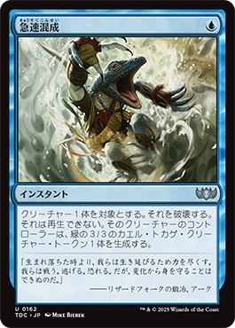 クリーチャー1体を対象とする。それを破壊する。それは再生できない。そのクリーチャーのコントローラーは、緑の3/3のカエル・トカゲ・クリーチャー・トークン1体を生成する。