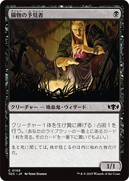 クリーチャー1体を生け贄に捧げる:占術1を行う。(あなたのライブラリーの一番上にあるカード1枚を見る。そのカードを一番下に置いてもよい。)