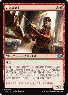 副官 ― あなたのターンの戦闘の開始時に、あなたがあなたの統率者をコントロールしている場合、飛行を持つ無色の1/1の飛行機械・アーティファクト・クリーチャー・トークン1体を生成する。ターン終了時まで、そのトークンは速攻を得る。