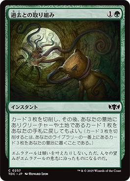 カード3枚を切削し、その後、あなたの墓地にありクリーチャーや土地であるカード1枚をあなたの手札に戻してもよい。(カード3枚を切削するとは、あなたのライブラリーの一番上にあるカード3枚をあなたの墓地に置くことである。)