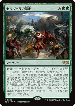動議 ― あなたから始めて各プレイヤーは「野生」または「解放」のいずれかに投票する。クリーチャー・カードが「野生」の票数に等しい枚数公開されるまで、あなたのライブラリーの一番上から1枚ずつ公開していき、それらのクリーチャー・カードを戦場に出し、その後、残りをあなたのライブラリーに加えて切り直す。「解放」1票につき、あなたはあなたの手札からパーマネント・カード1枚を戦場に出してもよい。