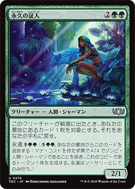 , あなたの墓地からこのカードを追放する:マナ・コストを持たず黒で4/4でゾンビ・人間・シャーマンであることを除き、これのコピーであるトークン1体を生成する。永遠はソーサリーとしてのみ行う。)