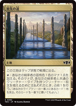:あなたの統率者の固有色1色のマナ1点を加える。そのマナが、あなたの統率者と共通のクリーチャー・タイプを持つクリーチャー・呪文を唱えるために支払われたとき、占術1を行う。(あなたのライブラリーの一番上にあるカード1枚を見る。そのカードを一番下に置いてもよい。)