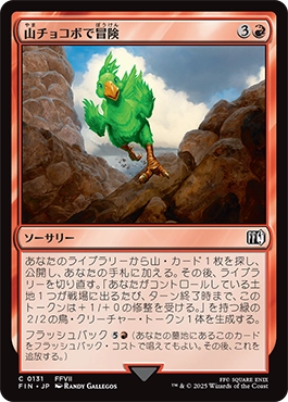 あなたのライブラリーから山・カード1枚を探し、公開し、あなたの手札に加える。その後、ライブラリーを切り直す。「あなたがコントロールしている土地1つが戦場に出るたび、ターン終了時まで、このトークンは+1/+0の修整を受ける。」を持つ緑の2/2の鳥・クリーチャー・トークン1体を生成する。