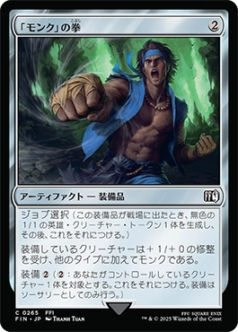装備しているクリーチャーは+1/+0の修整を受け、他のタイプに加えてモンクである。