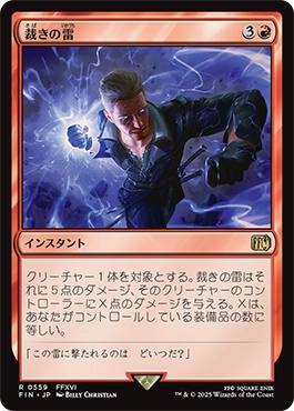 クリーチャー1体を対象とする。裁きの雷はそれに5点のダメージ、そのクリーチャーのコントローラーにX点のダメージを与える。Xは、あなたがコントロールしている装備品の数に等しい。