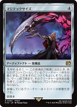 見切れるか! ― この装備品が戦場に出たとき、あなたがコントロールしているクリーチャー1体を対象とする。これをそれにつけてもよい。そうしたなら、ターン終了時まで、そのクリーチャーは先制攻撃を得て、このターン、可能ならブロックされなければならない。