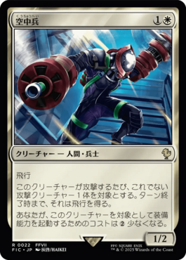 飛行このクリーチャーが攻撃するたび、これでない攻撃クリーチャー1体を対象とする。ターン終了時まで、それは飛行を得る。あなたが、このクリーチャーを対象として装備能力を起動するためのコストは