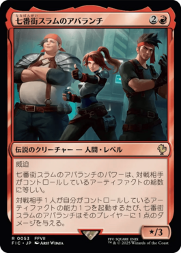 威迫七番街スラムのアバランチのパワーは、対戦相手がコントロールしているアーティファクトの総数に等しい。対戦相手1人が自分がコントロールしているアーティファクトの能力1つを起動するたび、七番街スラムのアバランチはそのプレイヤーに1点のダメージを与える。