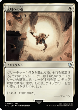 クリーチャー1体を対象とする。それを追放する。それのコントローラーは「自分のライブラリーから基本土地・カード1枚を探し、タップ状態で戦場に出す。その後、ライブラリーを切り直す。」を選んでもよい。