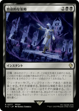 かそのクリーチャーの色のマナ1点を支払う。)クリーチャーやプレインズウォーカーである1体を対象とする。それを破壊する。致命的な策略を唱えるために召集した各クリーチャーはそれぞれ謀議する。(カード1枚を引き、カード1枚を捨てる。あなたが土地でないカードを捨てたなら、そのクリーチャーの上に+1/+1カウンター1個を置く。)