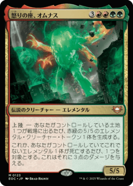 Landfall - Whenever a land you control enters, create a 5/5 red and green Elemental creature token.Whenever Omnath or another Elemental you control dies, Omnath deals 3 damage to any target.