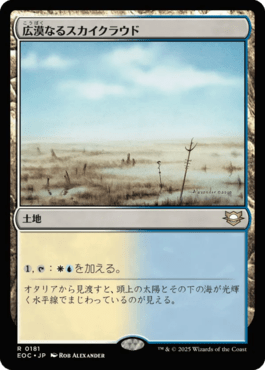 HOME > PRODUCTS > カードギャラリー > 久遠の終端 統率者 CARD GALLERY 『久遠の終端 統率者』のカード 《広漠なるスカイクラウド》 (マナ・コストは存在しません) Land {1}, {T}: Add {WU}. From Otaria, the sun above meets the sea below at a glittering horizon. , : Add . カードテキストは印刷カードのテキストをもとにしています。 『久遠の終端 統率者』のカード一覧