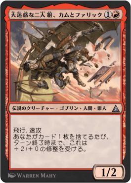 Flying, hasteWhenever you discard a card, Cam and Farrik gets +2/+0 until end of turn.