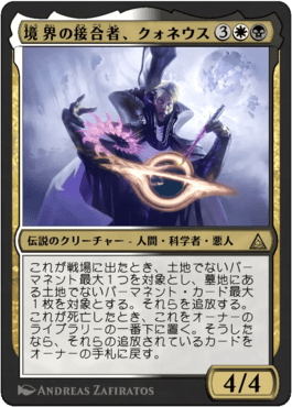 When Qoneus enters, exile up to one target nonland permanent and up to one target nonland permanent card from a graveyard.When Qoneus dies, put him on the bottom of his owner's library. If you do, return the exiled cards to their owners' hands.