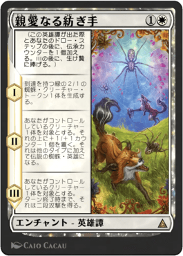 II - あなたがコントロールしているクリーチャー1体を対象とする。それの上に+1/+1カウンター1個を置く。それは他のタイプに加えて伝説の蜘蛛・英雄になる。
