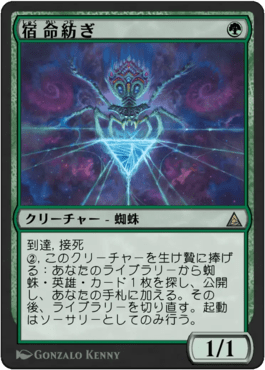 {2}, このクリーチャーを生け贄に捧げる:あなたのライブラリーから蜘蛛・英雄・カード1枚を探し、公開し、あなたの手札に加える。その後、ライブラリーを切り直す。起動はソーサリーとしてのみ行う。